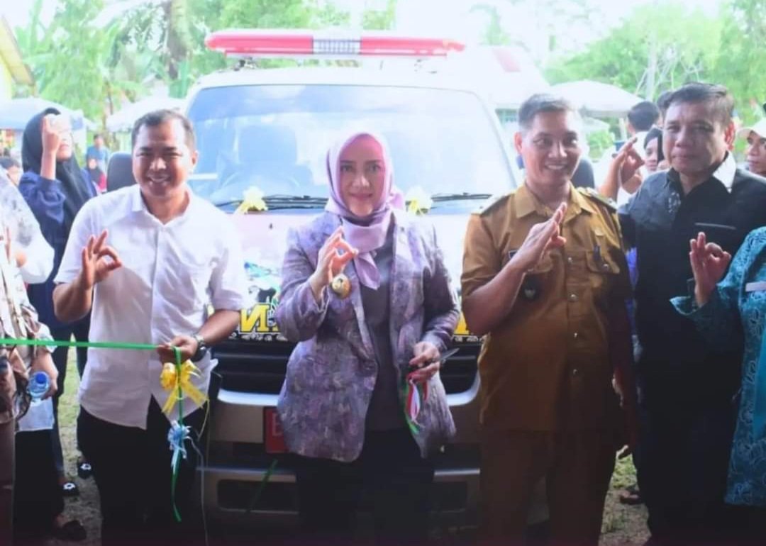 Bupati Musi Rawas Hj. Ratna Machmud menyerahkan bantuan 1 unit Mobil Ambulance kepada masyarakat di Desa Sukajaya Kecamatan Sumber Harta.