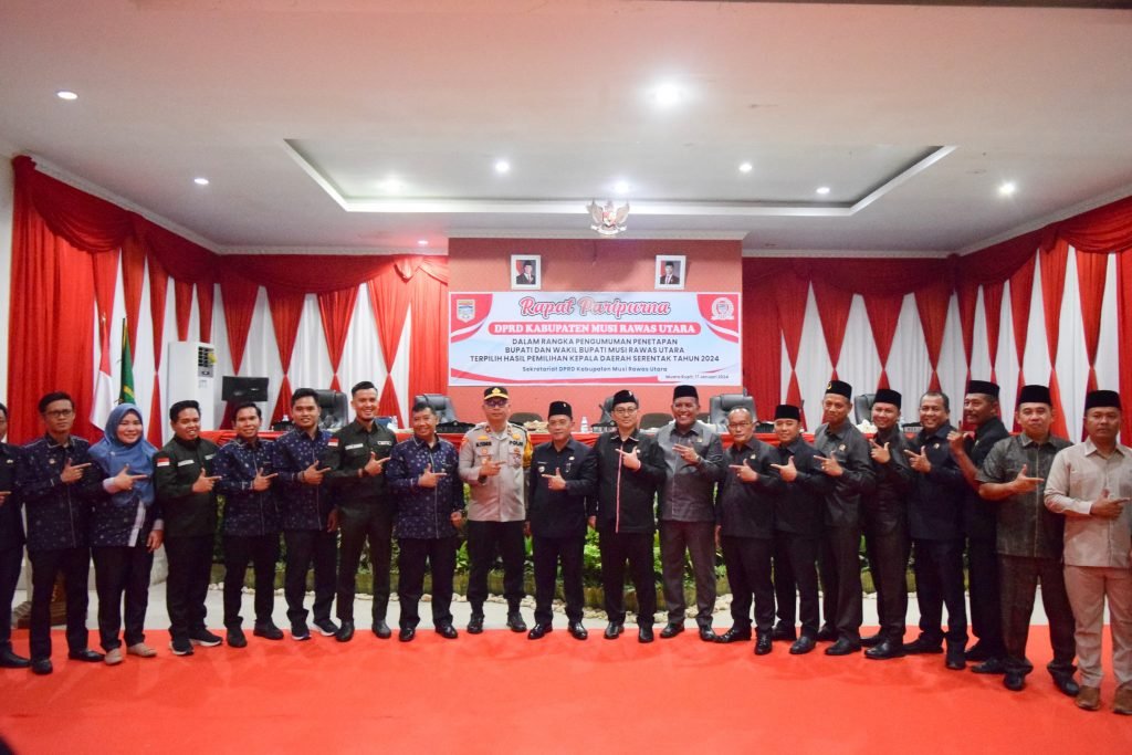 MURATARA, (lubuklinggauterkini.com) – Bupati Musi Rawas Utara (Muratara) H. Devi Suhartoni menghadiri Rapat Paripurna dalam Rangka Pengumuman Penetapan Pasangan Calon Bupati dan Wakil Bupati terpilih masa jabatan tahun 2025-2030 H. Devi Suhartoni dan H. Junius Wahyudi, di Ruang Rapat Paripurna DPRD Muratara, Jumat (17/1/2025).