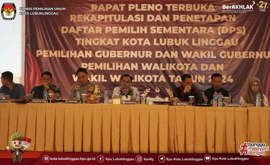 Pleno ini dibuka oleh KPU dan dihadiri Komisioner Ketua Aspin Dodi, Komisi SDM dan Parmas Andri Affandi, Komidi Data Vera Yulita dan Komisi Hukum Murtako serta Sekretariat KPU Lubuklinggau, mengundang, Bawslu, Disdukcapil, parpol dan perwakilan bakal calon pada Pemilihan Gubernur dan Wakil Gubernur Sumsel serta Walikota dan Wakil Walikota Pilkada Lubuklinggau 2024.